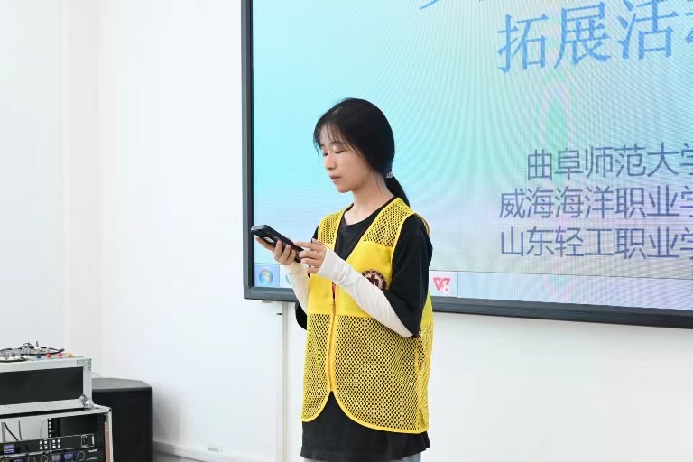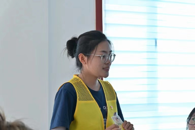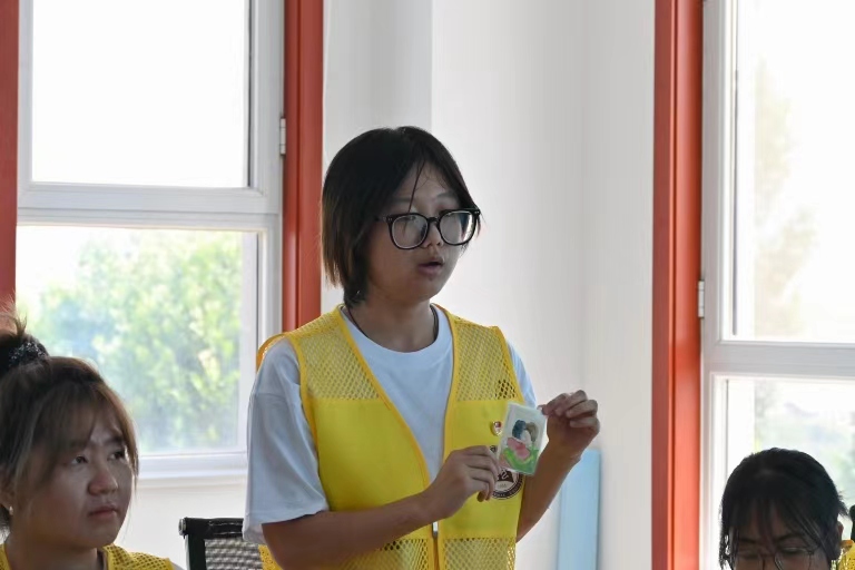 圖為曲阜師范大學(xué)煌·筑夢(mèng)鄉(xiāng)村振興促進(jìn)隊(duì)隊(duì)長(zhǎng)孫明瑜介紹自己的OH牌 實(shí)踐隊(duì)員 彭藝菲 攝