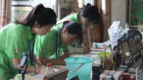 圖為實踐團成員親體驗身農民畫創作 大學生校園網通訊員 代媛媛 供圖
