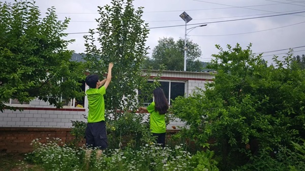 圖為志愿者在村民家里幫忙摘果子。 史子儀 攝