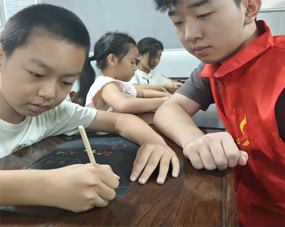在刮紙畫活動中,孩子們則體驗到了另一種獨特的藝術表達方式。黑色的刮畫紙在孩子們的手中仿佛被賦予了魔法,通過竹簽的輕輕刮擦,五彩斑斕的圖案逐漸顯現。孩子們在創作過程中,充分發揮了自己的想象力和創造力,將心中的美好愿景呈現在畫紙上。他們的作品或生動有趣,或意境深遠,無不令人贊嘆。