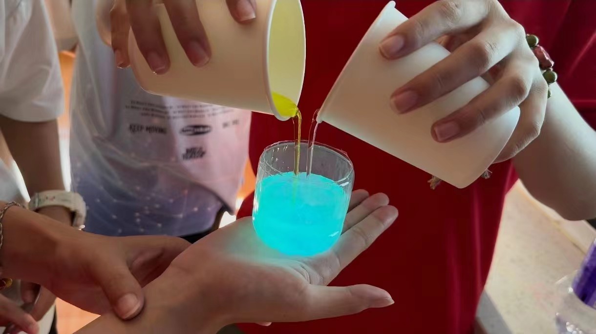 圖為志愿者向孩子們展示簡易凈水器在探索了水的奧秘后,志愿者們借助一系列精心設計的動畫與圖片,為孩子們詳盡闡述了“藍眼淚”現象的由來。他們明確指出,“藍眼淚”是由特定類別的浮游生物,如海螢與夜光藻,在夜晚遭遇外界刺激時所展現出的藍色熒光現象。隨后,志愿者們進一步講述了“藍眼淚”現象產生的條件,并強調了如何保護海洋環境以減少對這類生物的不利影響。為加深孩子們的理解與興趣,志愿者們還通過魯米諾反應實驗,成功模擬了“藍眼淚”的發光過程,讓孩子們在暗處親眼見證了藍色光芒的奇妙展現。這一互動環節極大地激發了孩子們對自然界奧秘的好奇心與探索熱情。