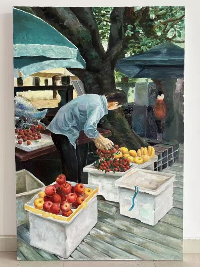 為了表達對果園工作人員在實踐過程中的積極配合與支持,實踐隊員們決定為果園創作一幅畫作并將其捐贈。在創作過程中,隊員們展現了高度的組織性與協作精神,他們各司其職,有的專注于細致入微的輪廓勾勒,有的則傾心于色彩的精心填充,而另一部分則致力于作品細節的精心雕琢。通過這種緊密的團隊合作,一幅洋溢著勃勃生機與盎然活力的油畫作品應運而生。