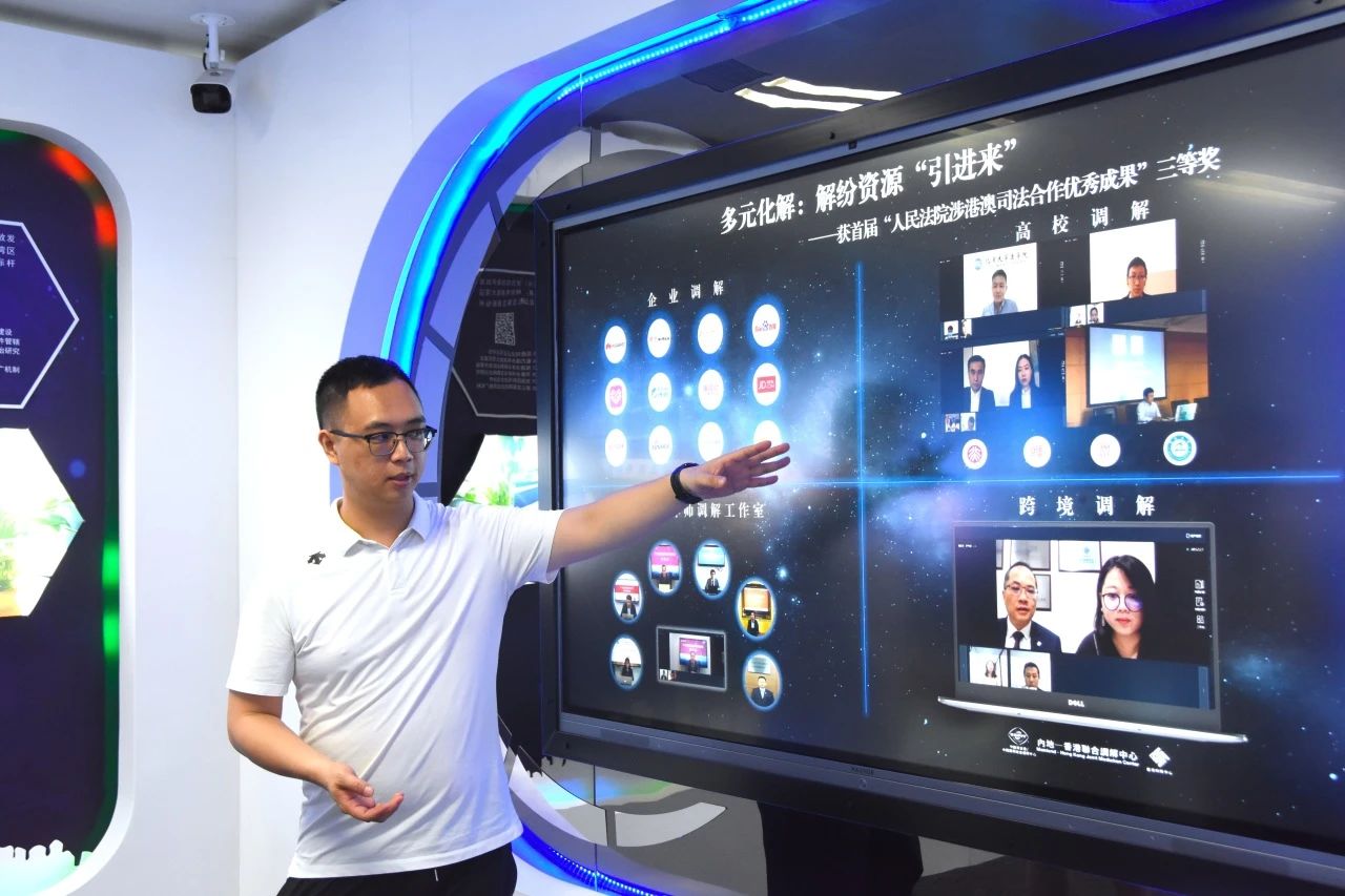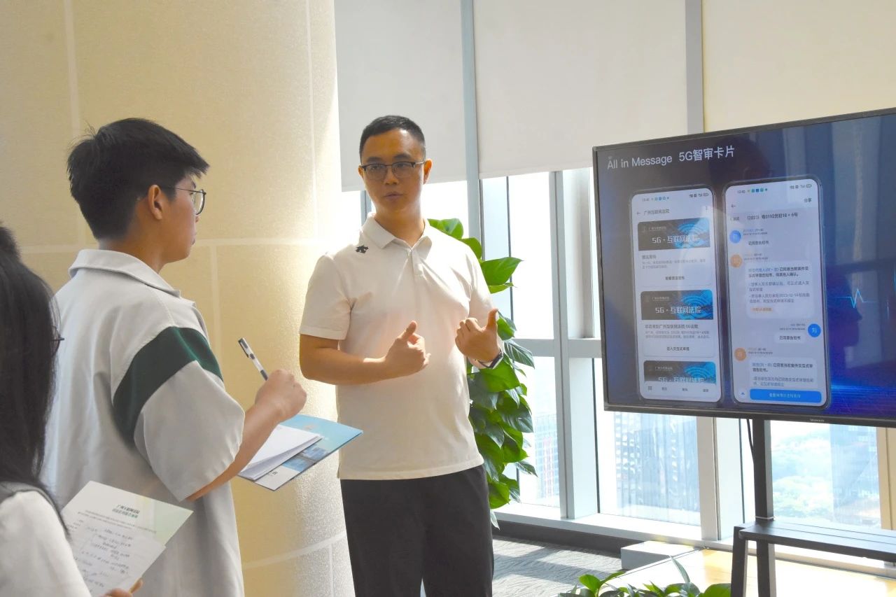 展廳分為“政治為本”、“公正為魂”“創(chuàng)新為源”和“科技為基”四個(gè)板塊。其中,“政治為本”板塊展示了廣州互聯(lián)網(wǎng)法院在黨建領(lǐng)域的成就,體現(xiàn)廣州互聯(lián)網(wǎng)法院過硬的專業(yè)水平與政治素養(yǎng)。“公正為魂”板塊展示了廣州互聯(lián)網(wǎng)法院審理的“麥某某訴法先生案”“全國首份人格權(quán)侵害禁令案”等典型案例,在林法官的細(xì)致講解中,實(shí)踐隊(duì)成員更加深入地了解了互聯(lián)網(wǎng)法院運(yùn)用數(shù)據(jù)化手段解決司法法律問題的獨(dú)特性和開創(chuàng)性。“創(chuàng)新為源”板塊與“科技為基”板塊描繪了廣州互聯(lián)網(wǎng)法院的未來發(fā)展藍(lán)圖,展示了“解紛資源‘引進(jìn)來’”、“ZHI系統(tǒng)”等數(shù)字化解紛途徑,引發(fā)隊(duì)員們對于通過互聯(lián)網(wǎng)法院或信息化手段解決網(wǎng)絡(luò)暴力問題的新思考。此外,林法官還向隊(duì)員們講解了廣州互聯(lián)網(wǎng)法院已經(jīng)投入使用的5G智審卡片以及E法亭司法便民服務(wù)終端,進(jìn)一步展示了互聯(lián)網(wǎng)法院極簡訴訟和高度信息化、智能化的發(fā)展趨勢。
