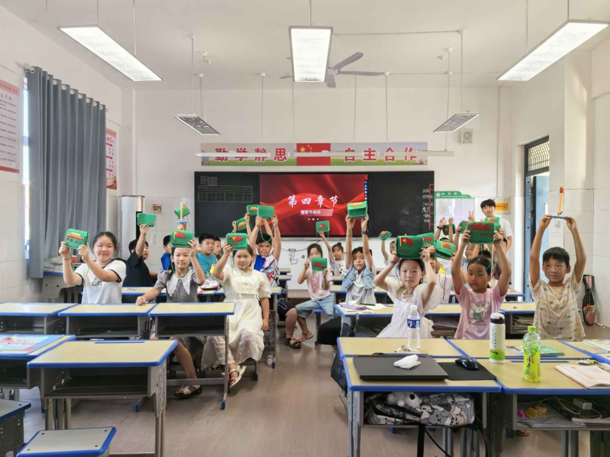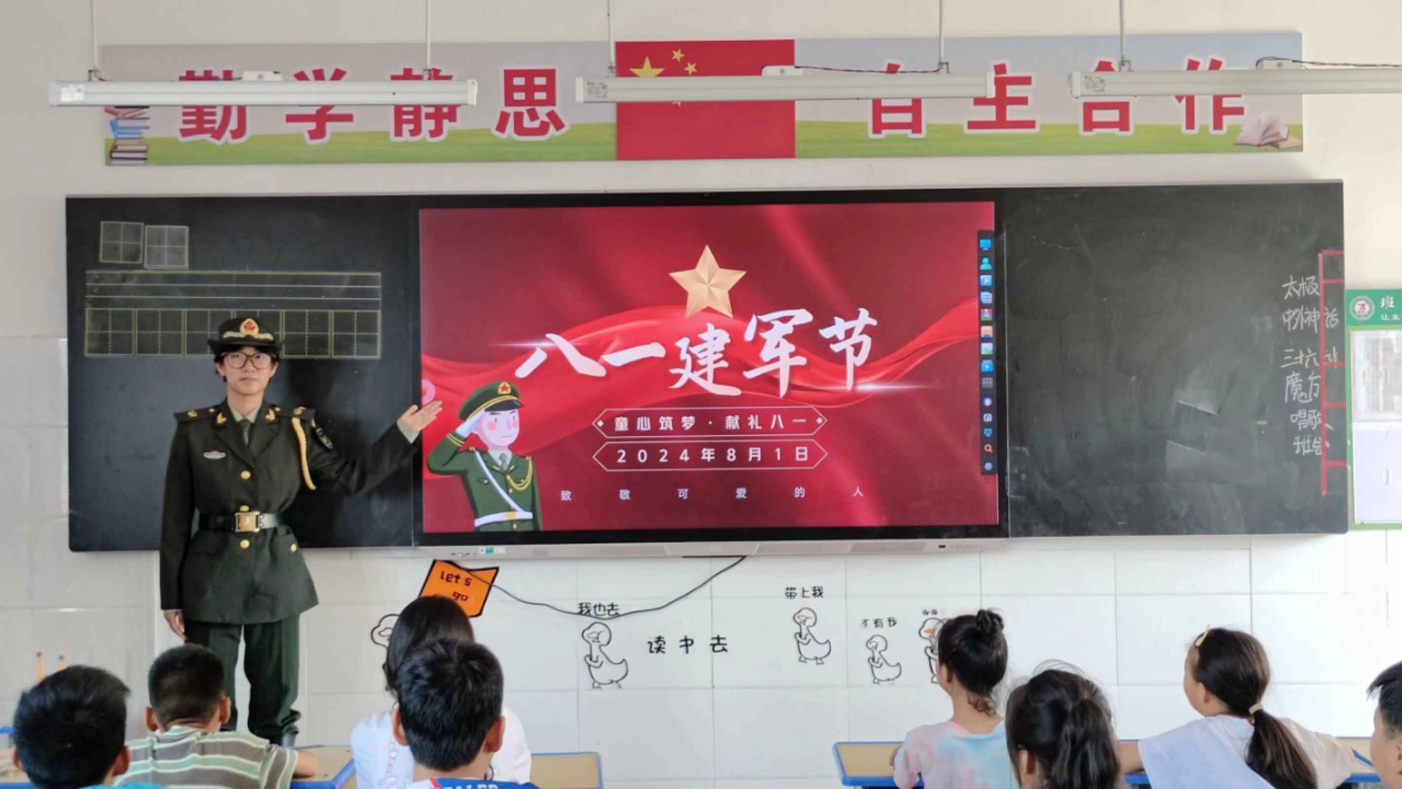 班會上,各班開展“小小衛(wèi)士·國防夢”專題活動。首先,主持人線上連線中國石油大學(華東)國旗護衛(wèi)隊隊長,由王隊作國防教育發(fā)言;其次,各班主講人講授建軍節(jié)相關的知識,國旗護衛(wèi)隊隊員兼支教隊隊長沈舒身著常服,為孩子們開啟紅色之旅,了解建軍節(jié)的歷史與中國軍種;然后,各班開展特色活動,低年級小朋友頭戴紅星發(fā)卡;三四年級小朋友分得專屬紅軍小書包,在隊長沈舒的帶領下,體驗升國旗儀式;五六年級小朋友制作紅色大風車,由支教隊員仇浩宇展示軍體拳,體驗立正、正步;最后,支教隊隊員和孩子們合影留念。國旗護衛(wèi)隊隊長的遠程寄語,如同穿越時空的號角,激蕩起孩子們對國家的崇敬與向往。紅軍小書包、紅星發(fā)卡、紅色大風車……一件件物品,承載著歷史的厚重與未來的希望,讓孩子們在升國旗的莊嚴儀式中,感受責任與榮耀;在軍體拳的剛勁有力中,體驗紀律與力量的美。最終,鏡頭定格,支教隊員與孩子們的笑臉交相輝映,定格了這個夏天最溫暖的記憶。