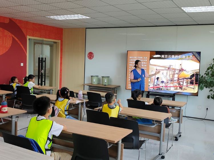 江寧織造博物館以清代江寧織造沿革為主線詳細展示了江寧織造署的興衰脈絡,從清代歷任江寧織造簡表到“勤政堂”復原陳列,再到江寧行宮圖、相關建筑模型……通過參觀學習,團隊成員們深入了解江寧織造府長達260多年的興衰歷史,感受到繁華背后深厚的文化內涵與歷史底蘊。漫步“云錦天衣”展館,穿梭于件件蹁躚的錦繡華服之中,透過華美繁復的花紋,仿佛能窺見歷史的厚重與浪漫。伴隨著志愿者的講解,成員們不禁被云錦工藝的精細復雜所震撼,更被云錦背后精益求精、一絲不茍的匠人精神所打動。