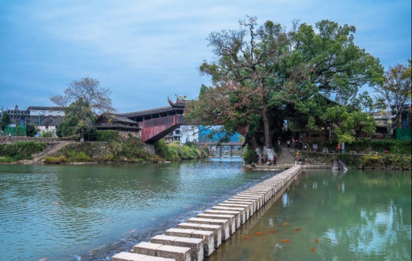 北澗橋為疊梁式木拱廊橋,橋長51.9米,寬5.4米,橋屋20間,橋柱84根,橋身全由木頭搭建。橋旁的碇步橋既能讓河水順利流過,又不影響游客過河。北澗橋被列為全國重點文物保護單位,并列入《中國世界文化遺產預備名錄》中。