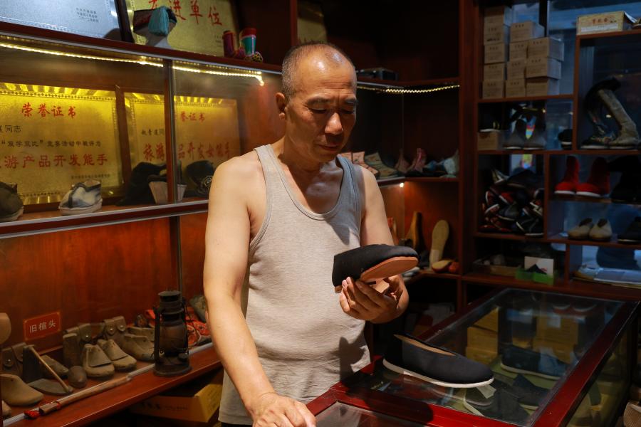之后,拾文思源實踐隊隊員來到了寶龍齋,這里彌漫著布鞋特有的質樸與溫馨。寶龍齋作為平遙布鞋制作技藝的代表性傳承地,其制作的布鞋以其舒適耐穿、樣式古樸而深受人們喜愛。在店內,傳承人侯天龍向隊員展示了從制作布鞋的大致工序,每一步都透露著匠人的精心與細膩。這些布鞋不僅是日常用品,更是承載著家族記憶與文化傳承的珍貴藝術品。