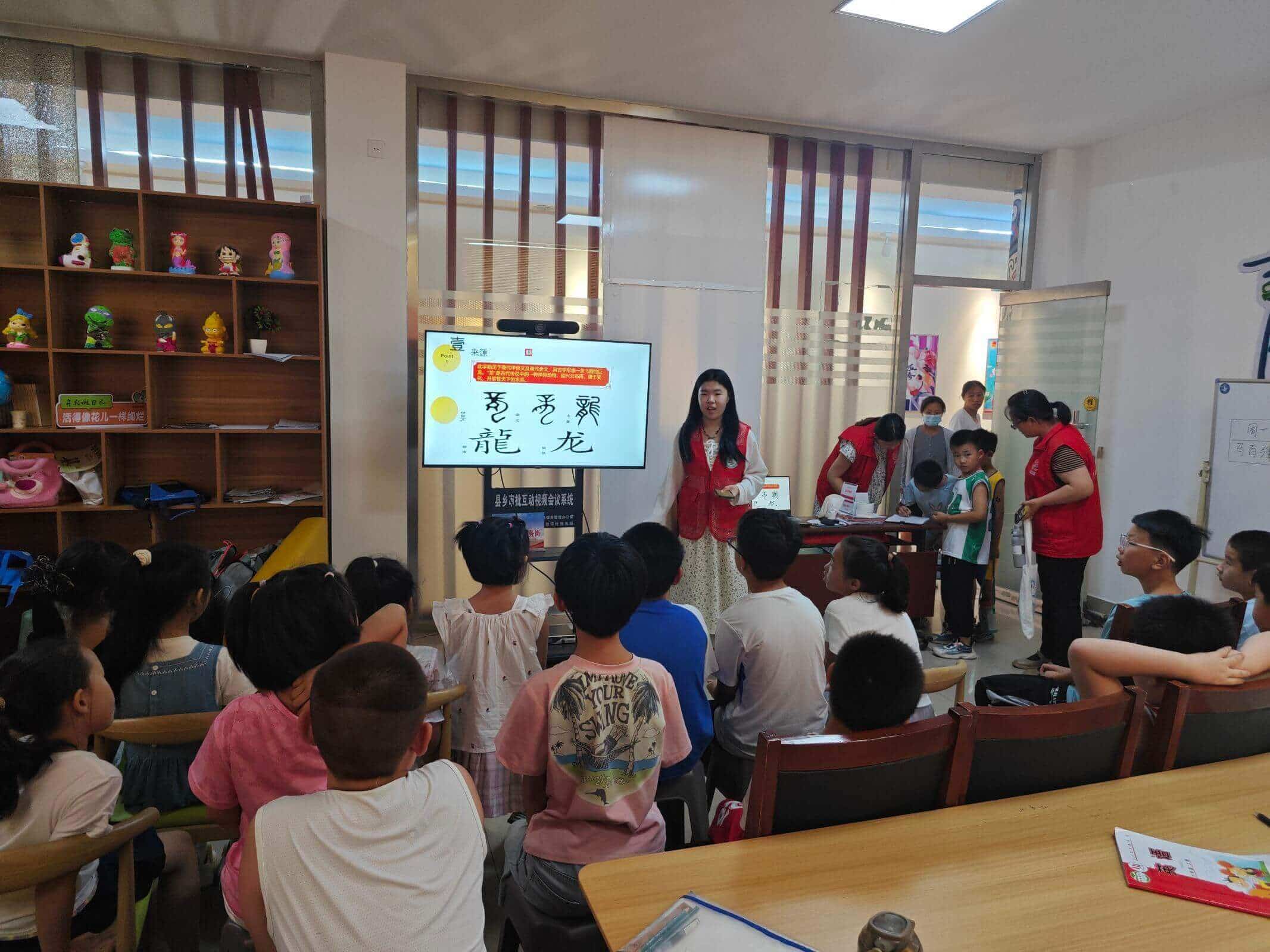 課程正式開始,授課人張寧宇首先用“龍”字的甲骨文引出話題,引導(dǎo)著孩子們猜測這個(gè)字的含義,孩子們踴躍回答,積極猜測,在老師耐心的引領(lǐng)下,他們終于成功得到了答案,龍的神秘傳說也在他們眼前娓娓道來,孩子們的小臉上滿是對龍的好奇以及對知識(shí)的渴求,中華傳統(tǒng)文化的魅力在孩子們的心中埋下了深深的種子。