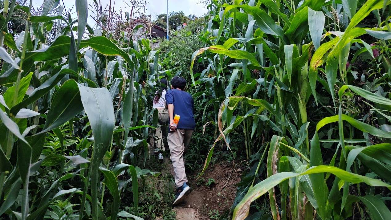 由于當地的家庭大多分布在山上,第一批隊伍需要翻過一座山再穿過許多鄉間小道才能到達當地村民家里,隊員們跟著當地孩子們一同花費了約一個小時才抵達村民家里,同時也深切感受到孩子們來上灣小學上課的不易以及大家對于知識的渴望,更加堅定了本次支教活動的使命感。
