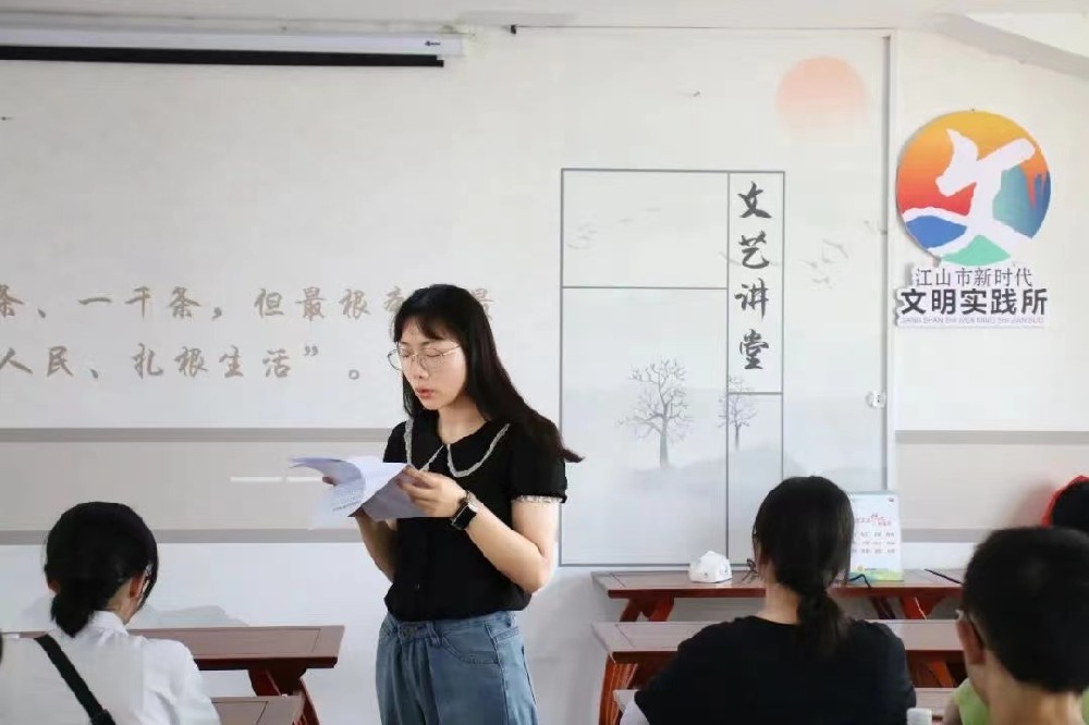 (圖為江山市保安鄉(xiāng)團(tuán)委書記毛慧琴用普通話進(jìn)行講解)