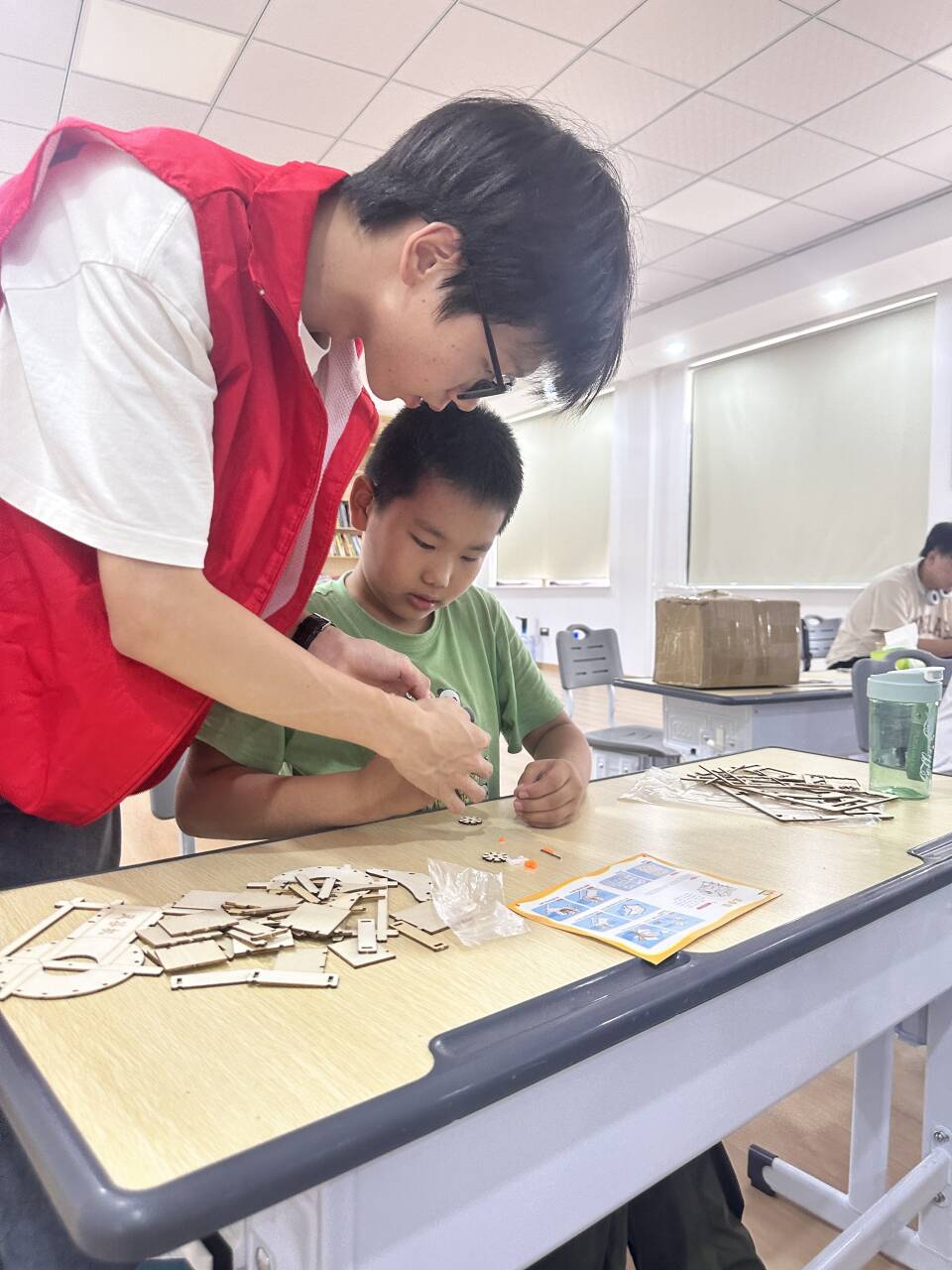在制作過程中,孩子們紛紛動手操作,分解部件、粘貼、組裝,每一個步驟都充滿了樂趣和挑戰。志愿者們則細心地在一旁指導,幫助孩子們解決遇到的困難。