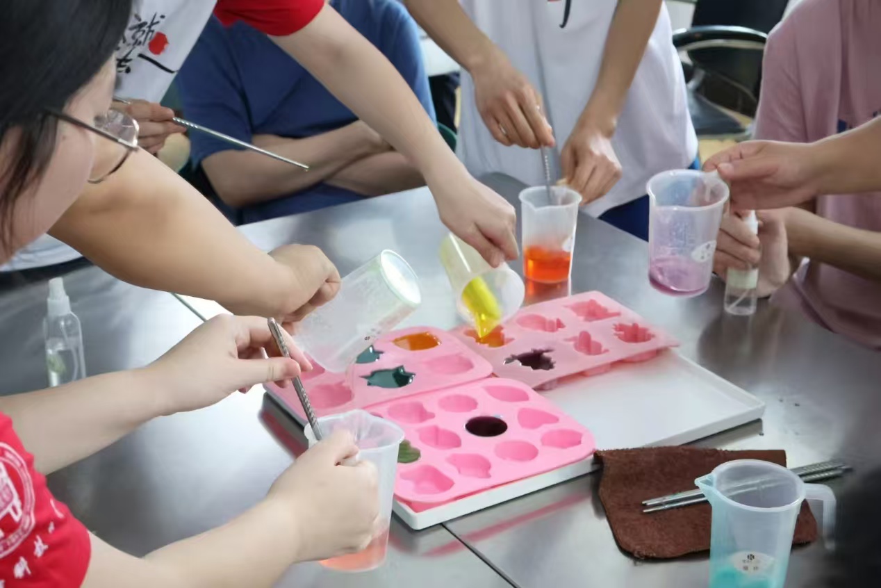 清晨的陽光中,小隊志愿者們與康復中心的學員們相聚在制皂坊,共同體驗制皂的樂趣。從切皂的小心翼翼,到熔皂的耐心等待,再到裝模時的滿心期待,大家齊心協力,讓一塊塊普通的材料變成了精美的香皂。
