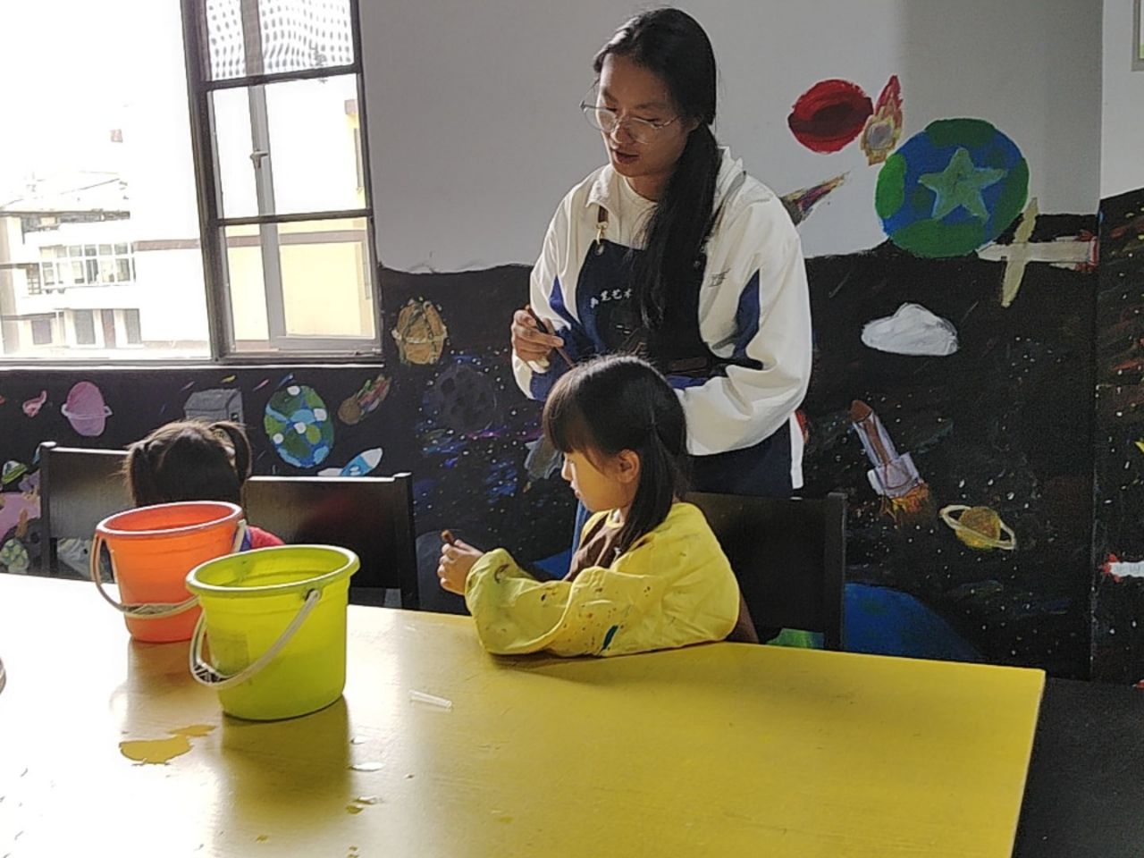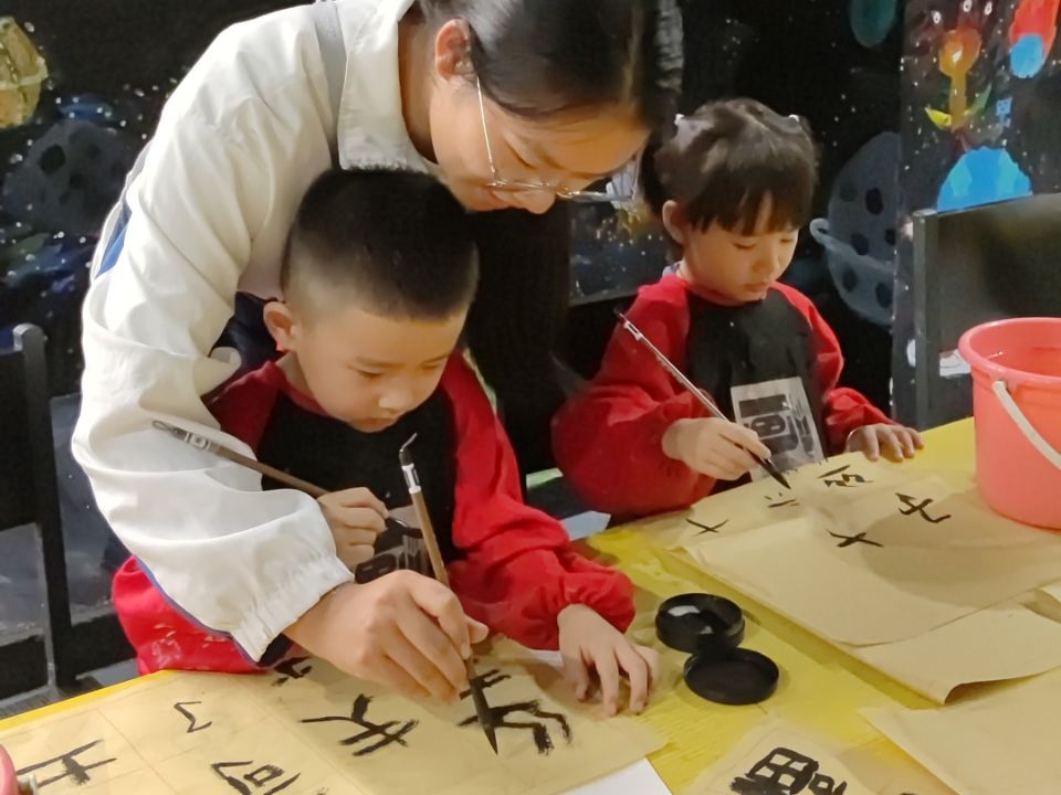 在毛筆開筆體驗環(huán)節(jié),實踐隊員們首先為孩子們準備了筆洗、軟布等工具,然后按照捻開筆頭、清除浮毛、浸泡新筆、清洗筆頭、整理筆毫、除去多余水分的步驟進行講解和示范,在此過程中孩子們都展現了極大的熱情,積極配合并在實踐隊員的指導和鼓勵下獨立的完成了毛筆開筆過程。實踐隊員通過講解示范和互動教學,讓孩子們了解和體驗到毛筆的開筆過程,從而激發(fā)他們對書法的興趣和熱愛。在毛筆握筆姿勢教學環(huán)節(jié),隊員們首先演示了正確的握筆姿勢,然后仔細的為孩子們講解了握筆方法以及每一個握筆要點,孩子們都睜大眼睛認真觀察并在實踐隊員們的指導和鼓勵下紛紛模仿。實踐隊員們在演示過程中不斷地觀察孩子們的學習情況并及時的糾正他們的握筆姿勢,確保每一個孩子都能正確、舒適的握筆。在此過程中,實踐隊員們還不斷地鼓勵孩子們之間互相觀察和交流,形成了良好的學習氛圍。最后,實踐隊員通過孩子們在學習握筆之前以及學習握筆之后的簡單字跡對比,讓孩子們在實際操作中體會正確握筆姿勢帶來的書寫舒適度和線條美感,從而加深對握筆姿勢重要性的認識。隊員們希望通過親身體驗的方式,能夠激發(fā)孩子們興趣并培養(yǎng)他們的藝術素養(yǎng)。