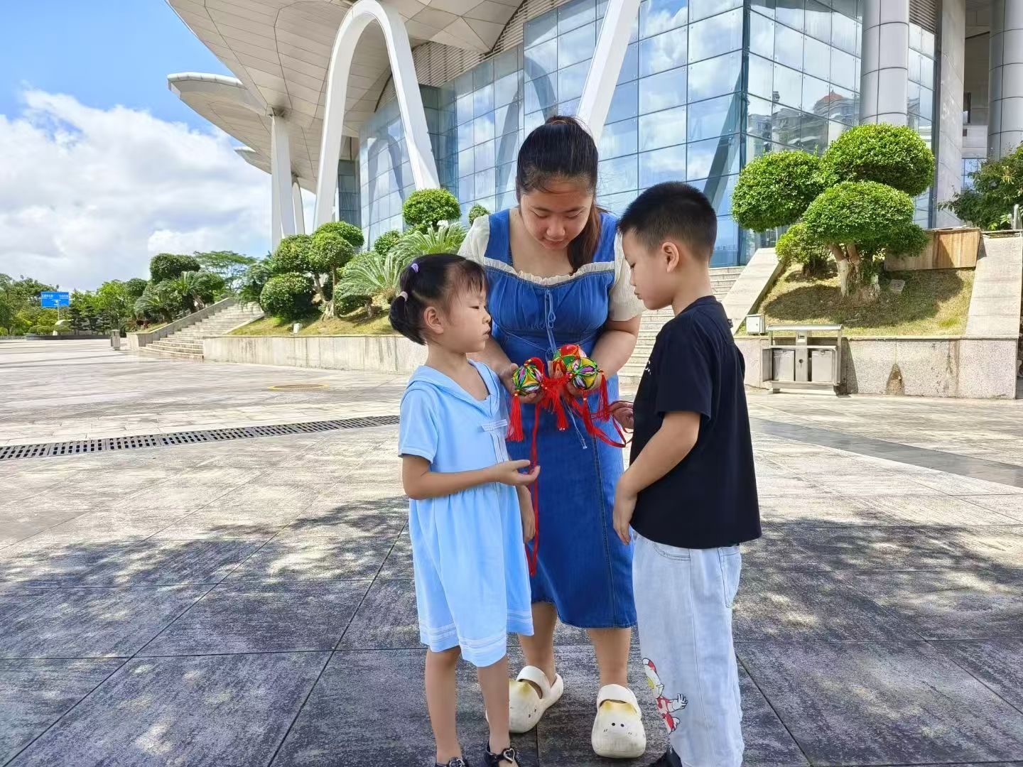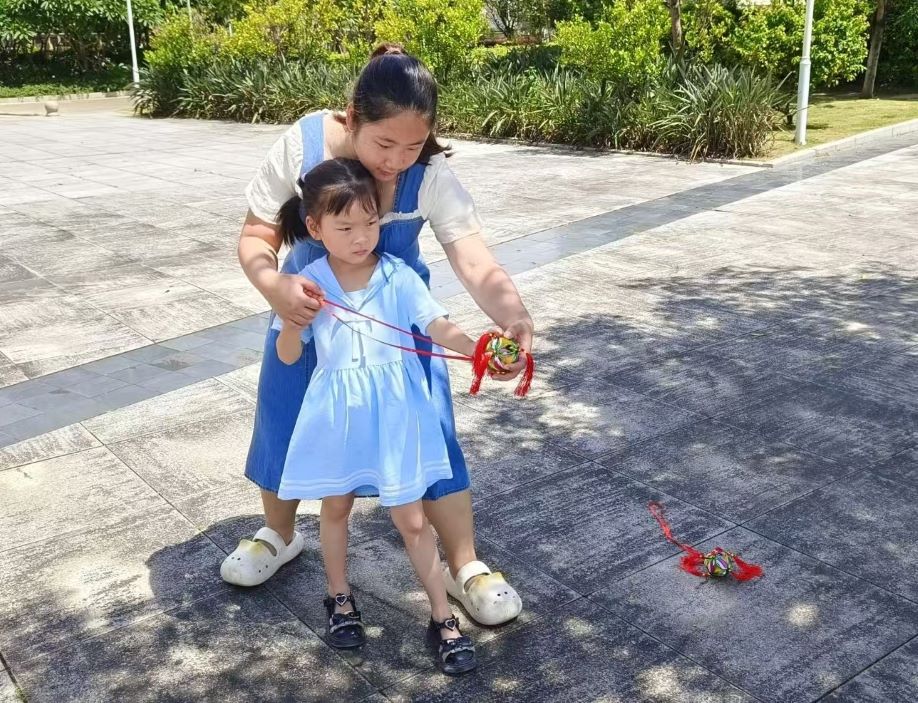 在拋繡球練習環節,實踐隊隊員首先將孩子們帶到北部灣海洋公園的空地上,強調注意事項并劃定孩子們的活動范圍以確保孩子們的安全以及活動的順利進行。接著,實踐隊隊員按照左手握球、右手系繩、調整距離、擺動一圈、控制力度、放手拋出的步驟進行講解和示范,在此過程中實踐隊隊員給予孩子們積極的鼓勵與引導,增強孩子們的自信心,使其對繡球有了初步的認識,并在實踐隊員的指導下獨立地嘗試練習。完成練習進入到拋繡球準備環節后,實踐隊隊員首先對孩子們的姿勢進行糾正。從手指自然彎曲、掌心朝上,到利用手臂手腕力量的力度,再到根據拋出目標的方向變化,實踐隊隊員積極引導孩子們進行靈活調整,并耐心回答孩子們在拋繡球中所遇到的問題。接著,實踐隊隊員們帶領孩子們一起拋繡球,通過互相拋、定點拋、來回拋等多種方式讓孩子們深入體驗拋繡球這項少數民族體育運動。在不同形式的運動中鍛煉孩子們的手臂肌肉、耐力、速度、技巧,提高其靈活協調能力,激發其對民族游戲的興趣,既讓他們在游戲中感受快樂,也讓孩子們真切地學習到寶貴的生活技能和文化知識,感受到陪伴的溫暖。