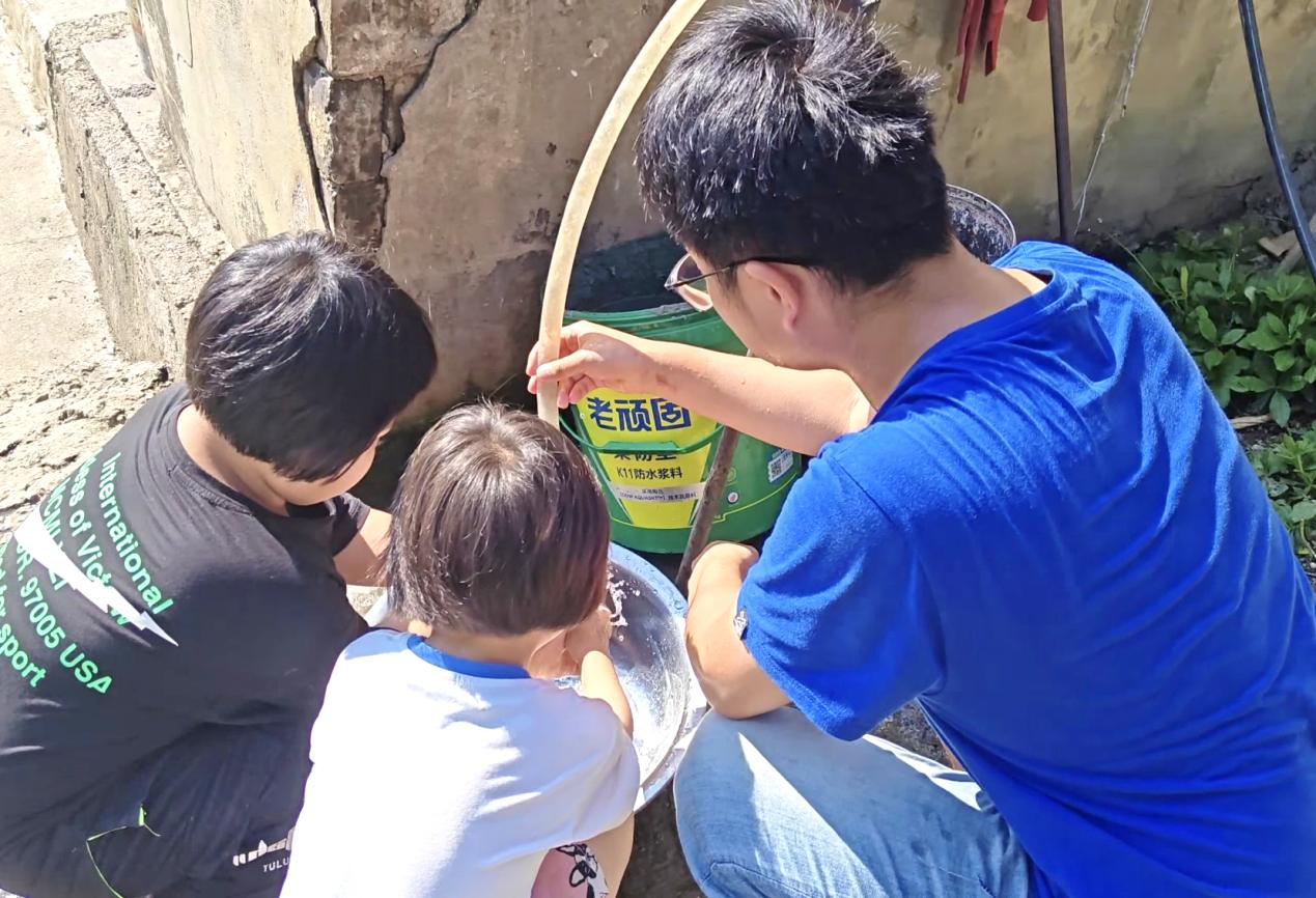 圖為實踐隊員帶領孩子們使用正確的方法洗手。徐國誠 供圖隨后,實踐隊員邀請孩子們上臺,讓孩子們展示自己的學習成果。孩子們興奮地卷起袖子,模仿著實踐隊員先前的動作,一絲不茍地完成每一個步驟,臉上洋溢著認真與喜悅。