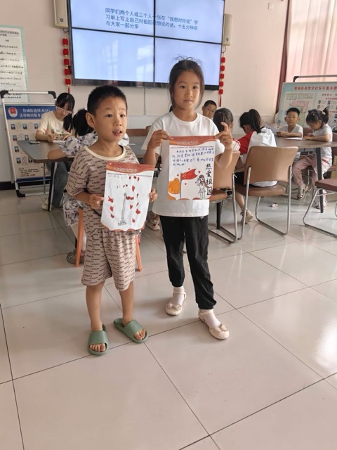 此次活動,團隊成員巧妙地將課堂分為三個部分,循序漸進地引導孩子們了解愛國情懷。首先,是“憶建國歷程”環節,志愿者們用生動的語言講述了我國艱難的建國歷史,并通過播放動畫片《那年那兔那些事》,讓孩子們在輕松愉快的氛圍中加深對建國史的記憶,更加深刻地體會到和平的來之不易。其次,是“祖國:我想對你說”環節。在這個環節中,孩子們拿起畫筆,用文字或圖案表達自己對祖國的熱愛。每一幅作品都充滿了孩子們純真的情感,每一個參加的孩子都擁有一顆熾熱的愛國心,他們用自己的方式表達了對祖國的無盡熱愛。最后,是“祖國旗幟在我心”環節。志愿者們詳細講解了國旗的由來、含義和象征意義,并通過趣味小游戲,讓孩子們在互動中進一步理解國旗的尊嚴和重要性。