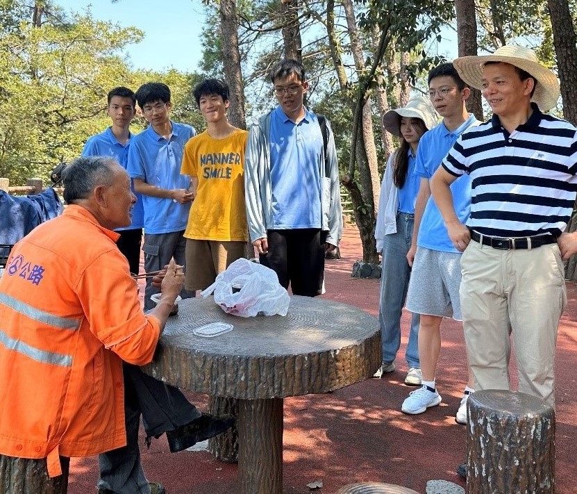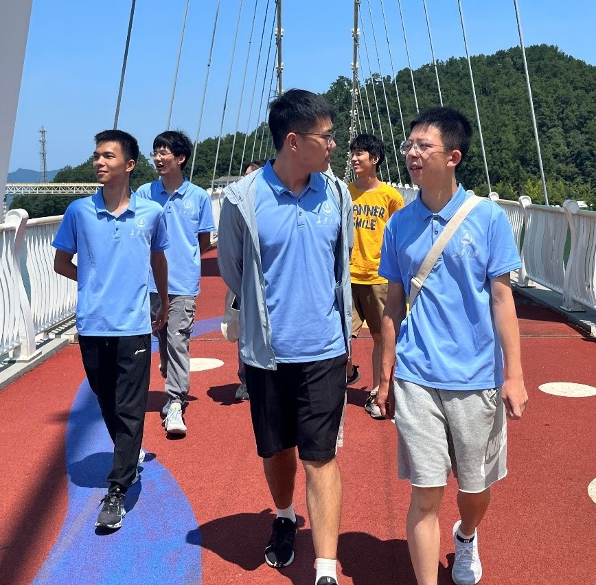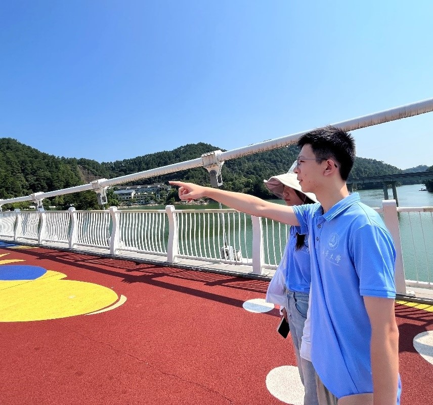 實(shí)踐隊(duì)員移步上江埠大橋和森林棧道。在上江埠大橋,朱榮華向?qū)嵺`隊(duì)員介紹了橋梁的穩(wěn)定結(jié)構(gòu)及監(jiān)測(cè)、養(yǎng)護(hù)系統(tǒng)等。實(shí)踐隊(duì)隊(duì)員了解到,在橋梁的設(shè)計(jì)與建造過程中,不僅應(yīng)當(dāng)考慮創(chuàng)新性,因地制宜、安全穩(wěn)定等基礎(chǔ)概念也必不可少。實(shí)踐隊(duì)員踏上森林棧道,棧道蜿蜒于山路之上,沿途箬竹、松樹等植物為自然形成。俯瞰山下,千島湖波濤碧水映入眼底,此番瀲滟晴方之景吸引了八方騎手前來打卡。