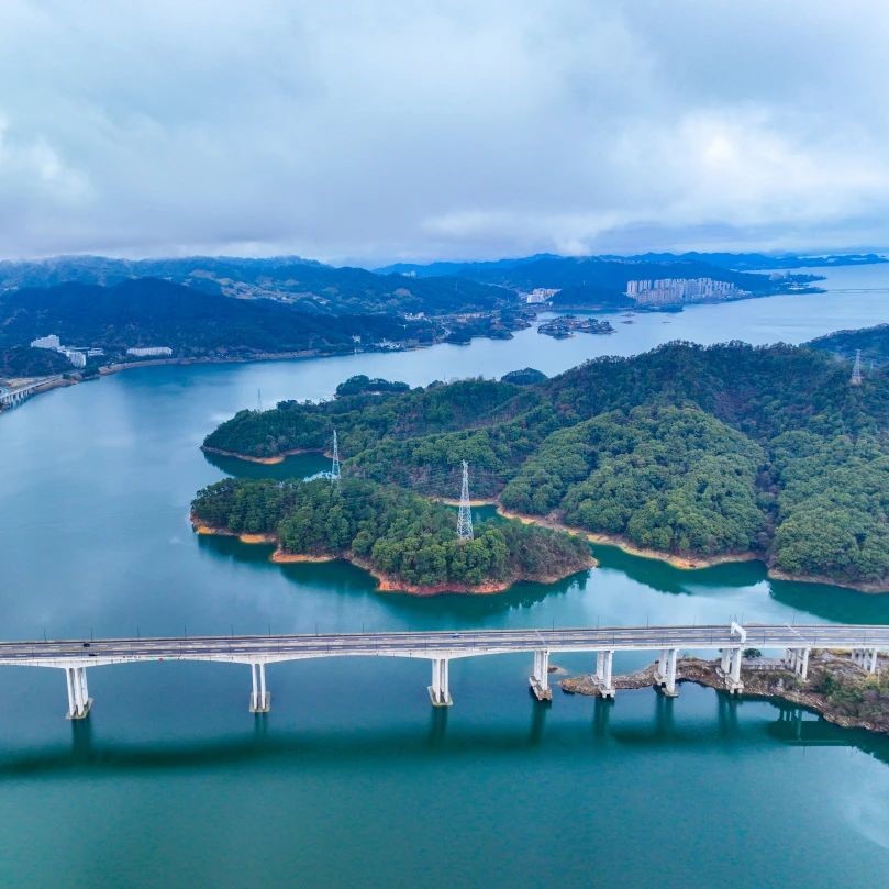 會后,實踐隊員實地走訪千黃高速沿線(淳安段),沿途風景如詩如畫,令人仿佛置身于一幅流動的山水畫卷之中。千黃高速自2017年9月全線動工,是浙江省唯一列入交通運輸部第二批綠色公路建設典型示范工程的重點項目。該項目起點位于浙江省與安徽省交界的塔嶺附近,終點接杭新景高速千島湖支線,全長51.422公里,設計為雙向四車道,共設置互通區5個,橋梁43座,隧道27座。