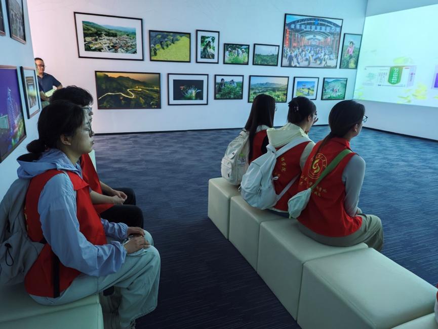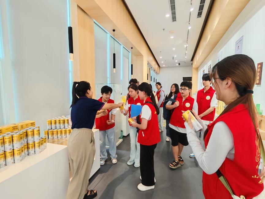 在成品展示區,實踐團成員們看到了琳瑯滿目的金銀花產品,包括藥材、茶飲、保健品等。解說員介紹了各種產品的功效與應用,成員們紛紛拿出手機拍照留念。