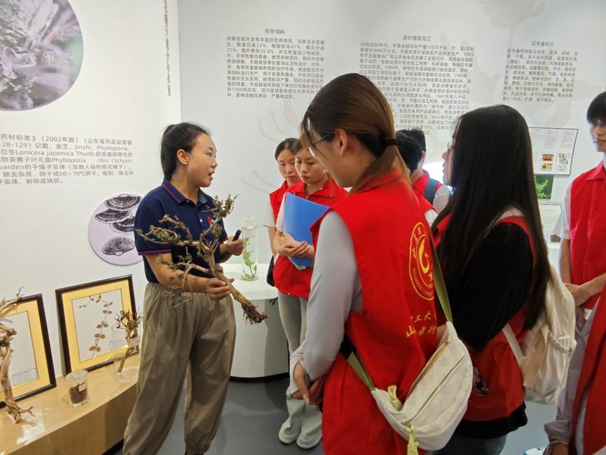 接著實踐團穿過山東中平藥業有限公司來到由山東中平藥業有限公司建造的金銀花博物館。在金銀花博物館的寬敞大廳內,實踐團成員們懷著濃厚的興趣,跟隨專業解說員的步伐。解說員展示了金銀花的種植工具、采摘技巧及種植模式,并讓實踐團體驗模擬采摘。講解金銀花的加工流程、炮制方法及炮制品特點后,成員們通過視頻領略了傳統工藝與現代技術的結合。