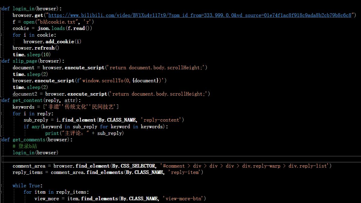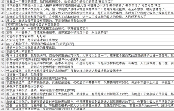 我們選擇了b站上一名知名非遺up主(南翔……)的非遺傳承視頻爬取評論,經過一段時間的努力,爬蟲程序成功獲取了大量的數據。經過對評論內容的分析,團隊成員發現用視頻傳承非遺是非常重要的方式之一,有些視頻能有千萬播放量,絕對是宣傳非遺的不二方式,其次就要注重非遺的可持續發展,應該將非遺與新時代生產方式和營銷方式結合起來,非遺在方便性上比不過工業產品,要讓人們覺得非遺產品物有所值,帶來足夠的價值,那非遺便可以當作奢侈品來宣傳。