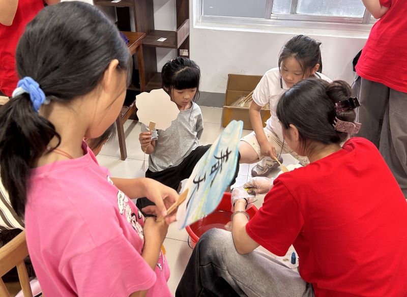 圖注 漆扇制作中志愿者與部分已完成制作的孩子們合照 尤冉自潔攝