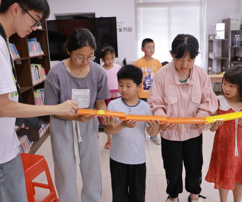 圖注 志愿者幫助小朋友們進(jìn)行“珠行千里”游戲 王澤曦 攝