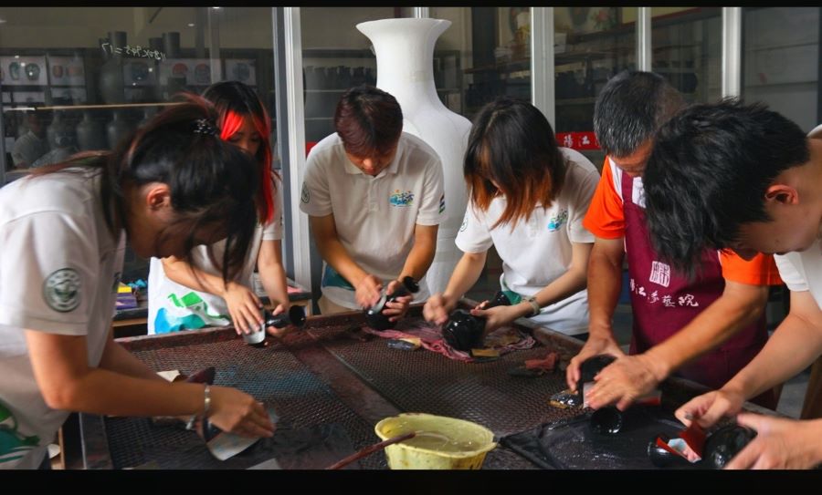 圖為實踐隊隊員在黎汝漢老師的帶領下體驗漆器的制作 實踐隊隊員張金普攝