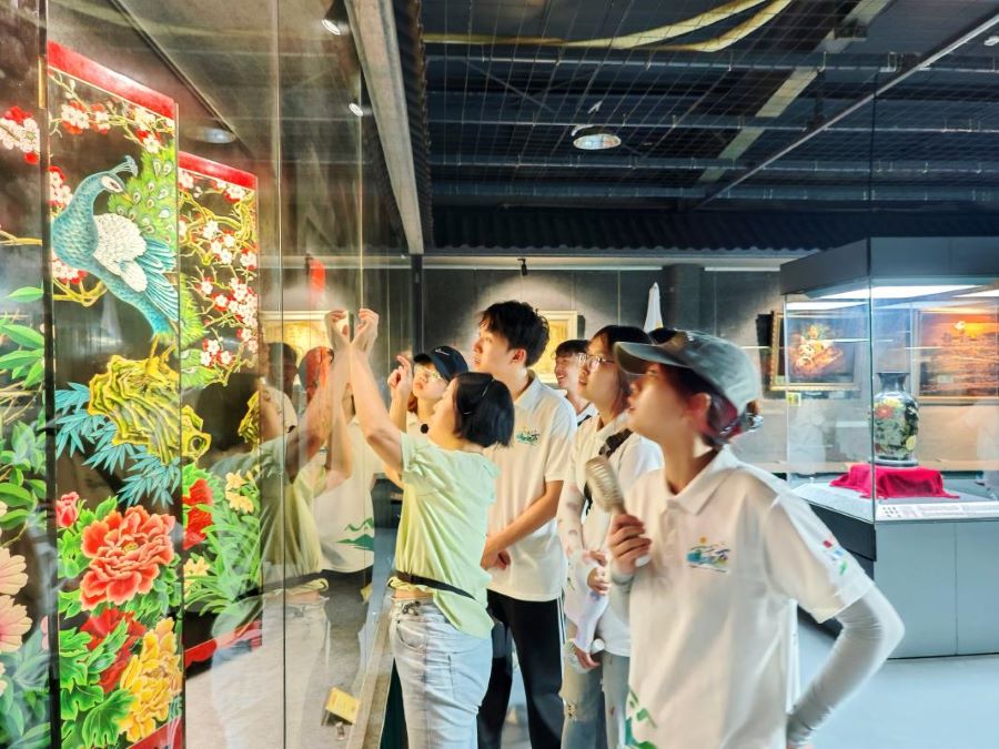 實踐隊全體隊員跟著講解員陳世苗的步伐,共同探究漆器的歷史。一幅幅精美的漆畫,一件件壯觀的漆器,不僅刻畫出非遺之美,更展示了中華文化的博大精深。隊員們在贊嘆之余,也對漆器的繁榮時期產生了濃厚的興趣。“明末清初時,已經做到前面是商鋪后面是制作工廠,這足以說明當時已經達到了漆器的繁榮時期。”陳世苗說。隊員們知曉館內保存的明末清初的漆器并非陽江漆器發展的開始時期。在參觀過程中,隊員們通過仔細觀察漆器和認真觀看介紹,深刻感受到了漆器帶來的心靈洗禮。此次漆藝博物館之行,隊員們深刻地意識到傳承中華文化的重要性,感受到中華文化的博大精深。
