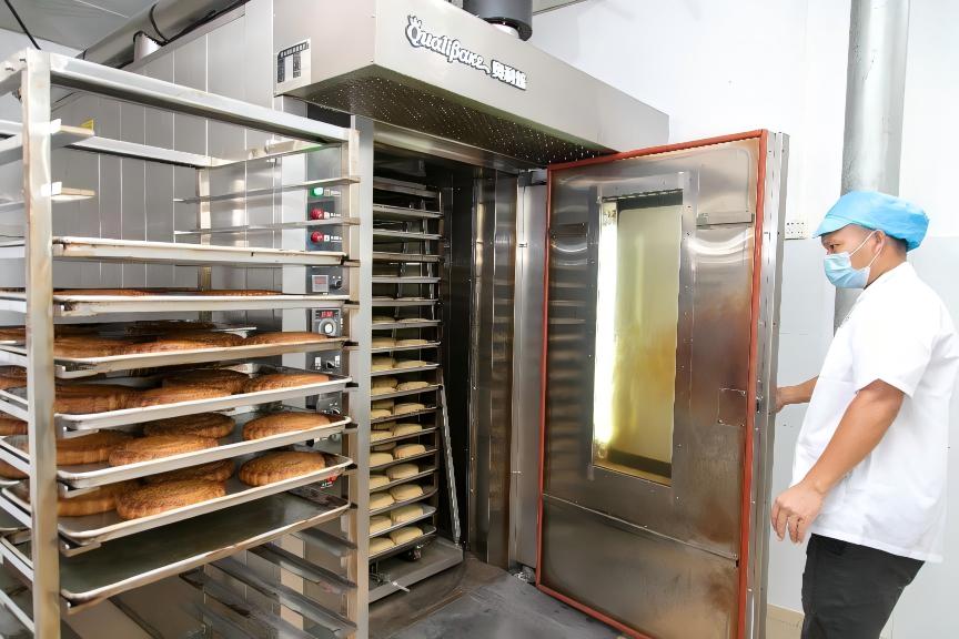 圖為月餅廠工人把月餅放進烘焙機里烘焙。張莉萍 供圖