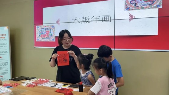 (圖為“尋遺筑夢(mèng)”社會(huì)實(shí)踐調(diào)研團(tuán)成員與小朋友們交流木版年畫時(shí)所攝)