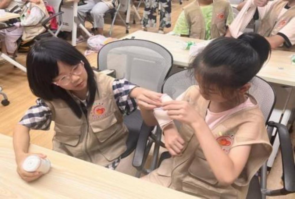 急救的主題繼續(xù)拓展,實(shí)踐團(tuán)成員向小朋友們科普包扎的技巧與應(yīng)用場(chǎng)景。有效傳播應(yīng)急救護(hù)知識(shí),實(shí)踐團(tuán)成員與小朋友們共同成長(zhǎng)!