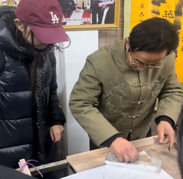 隨后,跟隨傳承人的講解,調研團成員親手體驗了木版年畫,一般來說,木版年畫的制作主要包括以下過程:起稿——畫師使用中國畫十八描技法將線條勾畫在燕皮紙上;刻版——將勾好的畫稿貼在刨平的梨木板上,用刀具將線條刻出,制作成墨線版和套色版;印刷——使用棕刷將顏料均勻地刷在畫版上,覆蓋宣紙,用粽耙拓印下來,一般先印墨線版,再逐色套印; 彩繪——楊柳青年畫等特定類型的年畫,在印刷后進行彩繪,增加畫面的生動性和細節;裱畫——將完成的畫作用傳統工藝裝裱起來,完成年畫的制作。跟隨這樣的步驟,一幅栩栩如生的木版年畫就制作好了。