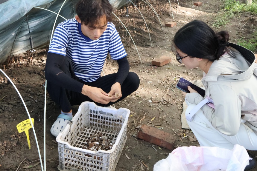 抵達蘆村生態園后,實踐團首先被引入了一片郁郁蔥蔥的林下世界。這里,蘑菇種植與傳統林業完美融合,形成了一幅獨特的生態畫卷。在園區技術人員的引導下,成員們深入林間,親眼見證了蘑菇從菌絲到子實體的奇妙蛻變過程。技術人員詳細講解了林下經濟的優勢:利用林間空地種植蘑菇,不僅有效利用了土地資源,還減少了化肥農藥的使用,保護了生態環境,實現了經濟效益與生態效益的雙贏。