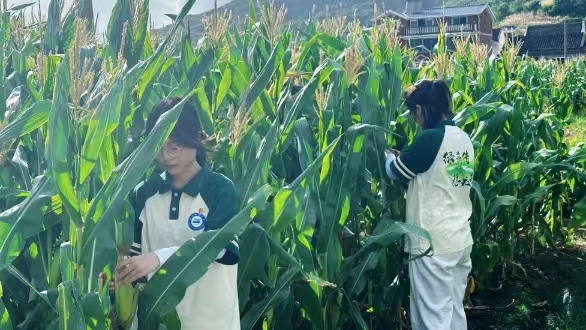 圖為團隊成員幫助農戶采摘玉米。戴若怡 供圖