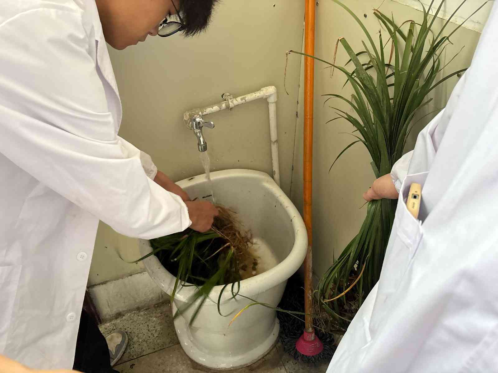 先是用鏟子輕輕拍掉挖出來的石菖蒲根上的泥土,接著在水龍頭下仔細(xì)沖刷根莖上的泥土以及一些小昆蟲。清洗干凈后,轉(zhuǎn)交其他隊員進行修剪工作,將附著在石菖蒲上的雜草以及石菖蒲的須根和葉剪除,完成剪除后再次進行清洗。