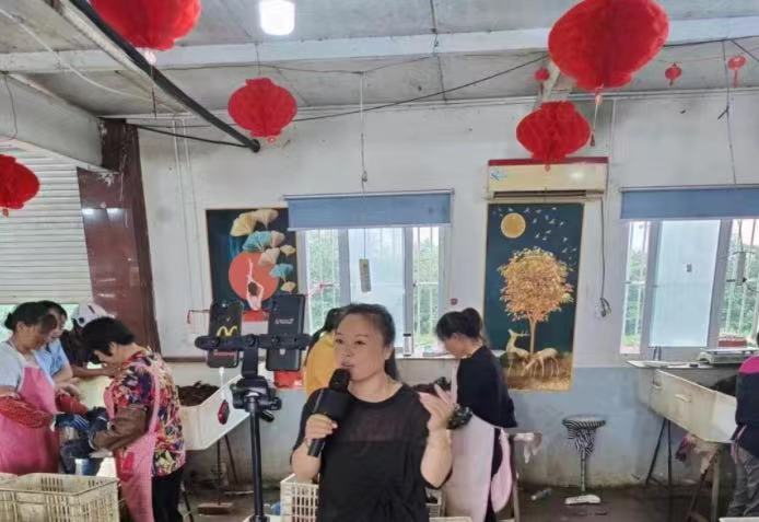 跟隨唐書記的腳步,實踐團隊成員又來到一處龍蝦養殖戶的廠房中,廠房中養殖戶正在進行直播帶貨,背景便是工人們分裝剛捕上來的龍蝦的真實場景。唐書記表示道:“這是我們村直播帶貨的典范,一開始是每家養殖戶都會開直播,但就屬他家直播的人氣和銷量最高。現在她不僅帶自家的貨,還幫著帶別人家的貨呢!”