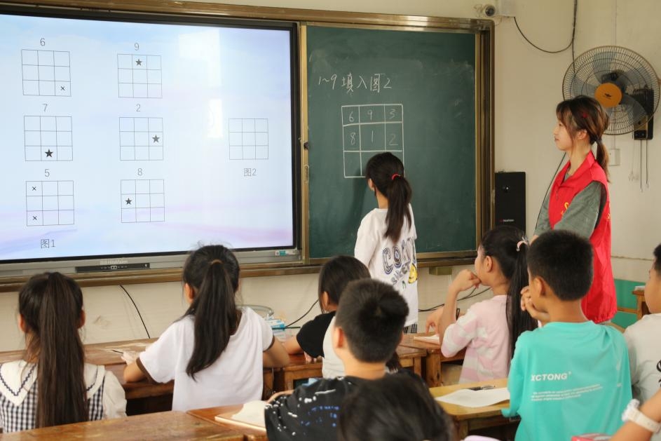 7月4日上午,實踐團隊分兩個教學班對石羊小學四、五年級共50余名小朋友開展支教。趣味數學課上,志愿者通過數學典故、數學游戲、教具操作等方式帶領同學們探索數學奧秘和樂趣;通過多媒體演示、板書講解、小組討論、問答等形式充分調動同學們的積極性,培養同學們的數學思維。暑期安全教育和心理健康教育課上,志愿者從防溺水、交通安全、防災減災等方面,立足當地實際開展暑期安全教育;從心理知識普及、心理問題預防、發現和調試等方面深入淺出地教會小朋友們如何應對“情緒小怪獸”。志愿者還為同學們準備了豐富的小禮品,課堂上時時傳來陣陣歡聲笑語。當天暴雨傾盆,但是絲毫沒有影響團隊成員和小朋友們的熱情,許多家長冒雨送小孩前來,有位老奶奶激動地說:“那么大的雨,路那么不好走,你們還堅持上課,再大的雨我也要送家里的小孫子過來。”