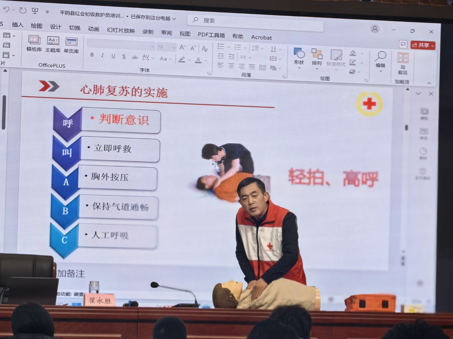 會上,縣紅十字會黨組書記、常務副會長翟永勝為大學生帶來《急救知識與技能普及培訓》。他強調了急救知識的重要性,通過實際演示與理論介紹相結合的方式,以簡單易懂的語言,詳細講解了心肺復蘇、AED 使用等急救知識與技能,切實幫助大學生掌握急救方法。同時,翟永勝結合自身經歷,分享急救經驗,有效提升了學生們在面對急救情況時的應急處理能力。
