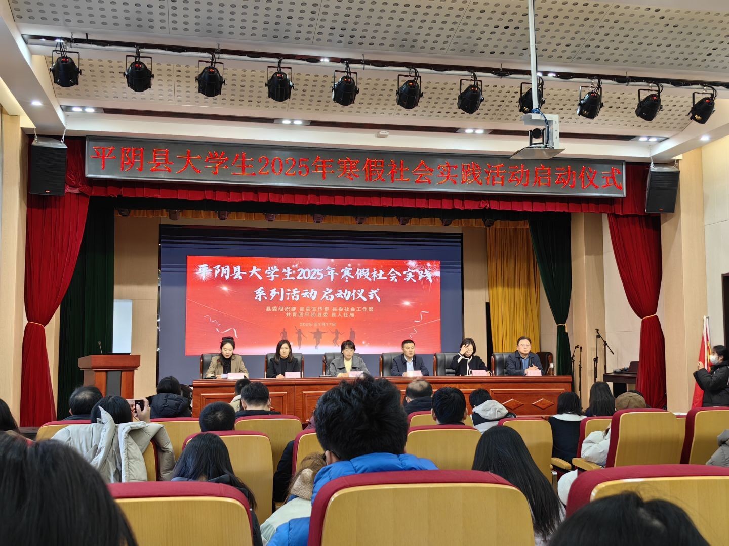 1 月 17 日,平陰縣大學生 2025 年寒假社會實踐系列活動啟動儀式在縣老年大學芳華劇場盛大舉行。山東大學學生春暉社“平蕪春山”支教隊與平陰縣縣委組織部、縣委宣傳部、縣委社會工作部、團縣委、人社局分管負責同志,各街鎮、各接收單位具體負責同志,“青鳥計劃” 大學生以及山東建筑大學支教團共同參與了此次活動。