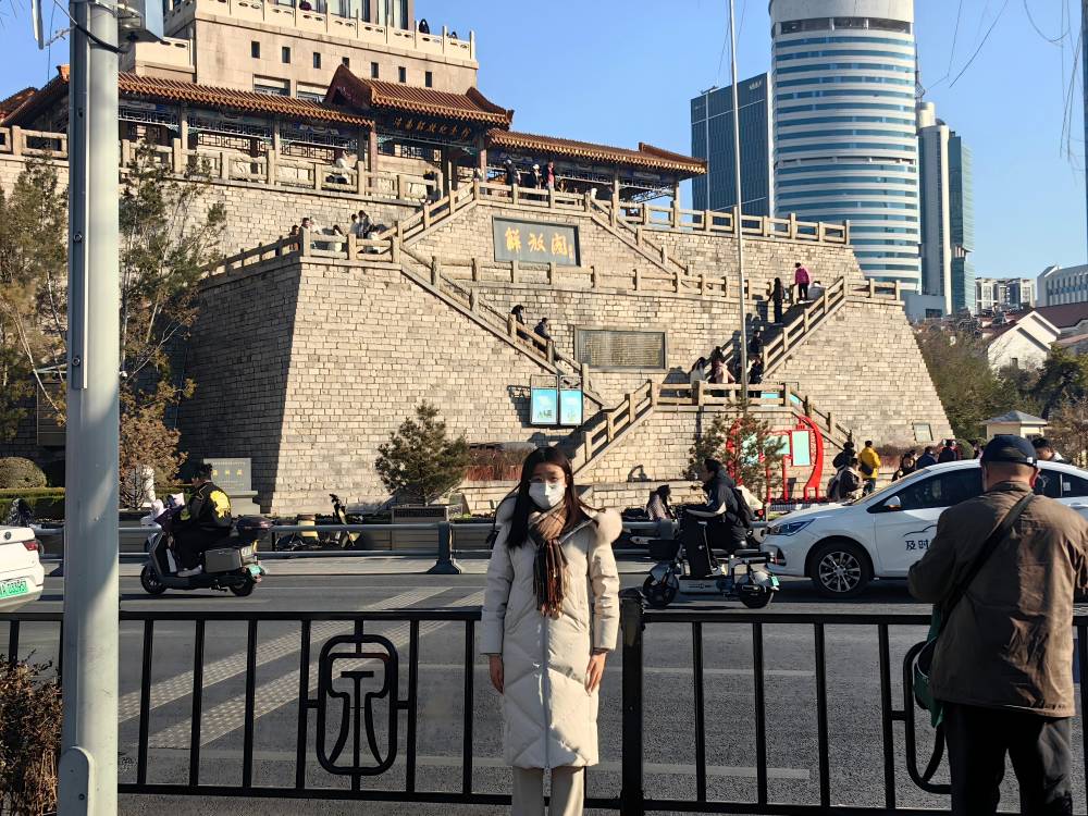 實踐隊首先來到解放閣樓下,這座建于濟南古城墻遺址之上的樓閣采用中國古典建筑形式,金黃琉璃瓦,外用花崗石貼面,廊閣繪有山水、花卉、魚蟲、飛禽、走獸等,彰顯著歷史的厚重與文化的底蘊。解放閣的前身是濟南古城墻的東南角即魁星樓,歷經數百年風雨洗禮,見證了濟南城的興衰變遷。1948年9月,濟南戰役打響,人民解放軍經過八晝夜的浴血奮戰,解放軍從這里突破,濟南戰役取得勝利。英勇的戰士們前赴后繼,冒著敵人的槍林彈雨,奮勇攀登城墻,為解放濟南開辟了勝利通道,殺敵10.4萬人,犧牲了五千多人。戰后,為紀念濟南戰役的偉大勝利和緬懷革命先烈,濟南人民將這座飽經戰火的城樓改建為解放閣。站在閣下,抬頭仰望,一種對革命先輩的崇敬之情油然而生。