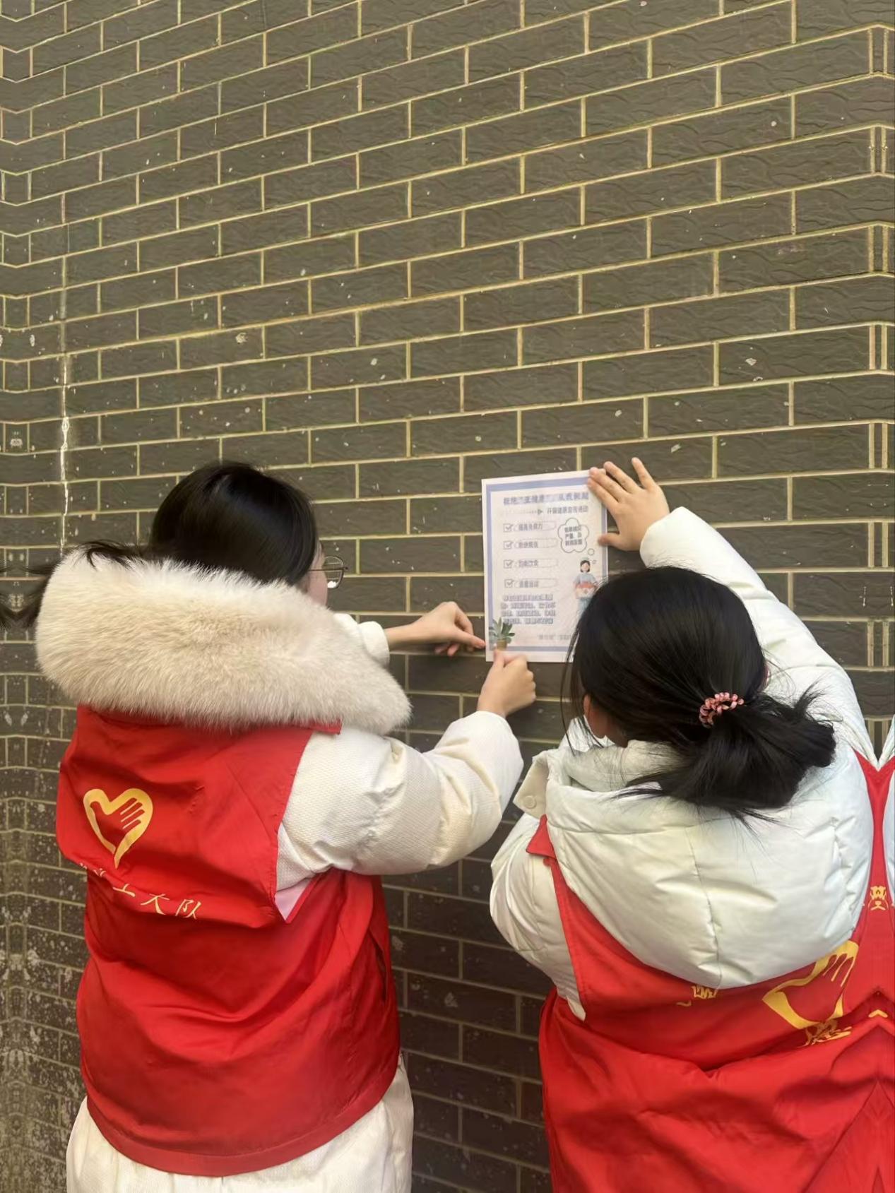 當天,隊長張簫冉帶領實踐隊員不僅在社區公告欄、電梯間、樓道口等顯眼位置張貼了海報,還深入到社區的各個小區和商業街進行宣傳。在小區內,他們挨家挨戶地將海報張貼在單元門口;在商業街,他們將海報張貼在店鋪的櫥窗上。一路上,他們還向居民們發放了相關的宣傳資料,進一步普及亞健康知識,并宣傳著“日行一萬步,健康一輩子”的口號。