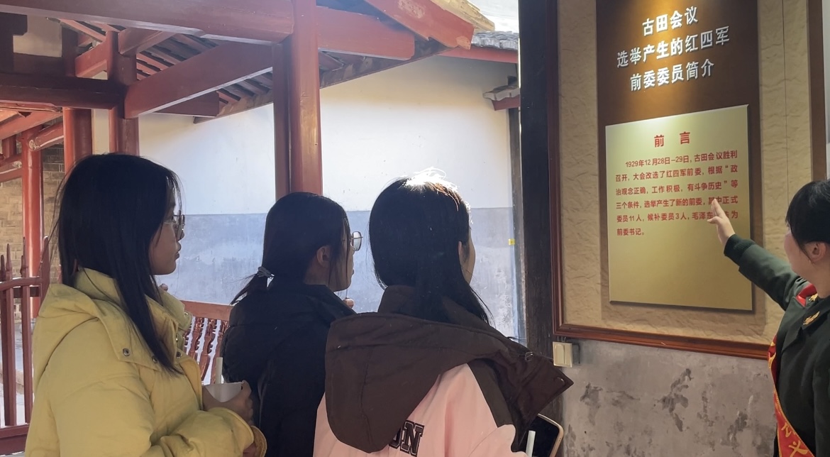 1月21日上午,實踐隊來到古田會議紀念館和古田會議舊址。在參觀過程中,實踐隊有幸邀請到軍隊的義務講解員共同開展志愿宣講,他們懷著崇高敬意和責任感,向參觀者重點解讀了由毛澤東同志首次提出的“使黨員的思想和黨內的生活都政治化,科學化”的思想,以生動的講述為參觀者帶來了沉浸式的教育體驗,讓革命歷史更加鮮活,讓古田會議精神煥發新的時代光彩。隨后,實踐隊移步毛主席紀念園,拾151級階梯而上,在毛主席肅穆雄偉的白色雕像前,成員們深懷崇敬之心,敬獻花束,深鞠三躬,環繞雕像行走一周,并組織參觀者們齊聲朗誦《七律·長征》,共同深切緬懷老一輩革命家的豐功偉績.
