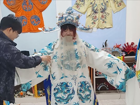圖為劇團工作人員幫助實踐隊員試穿戲服。魏嘉慧 供圖