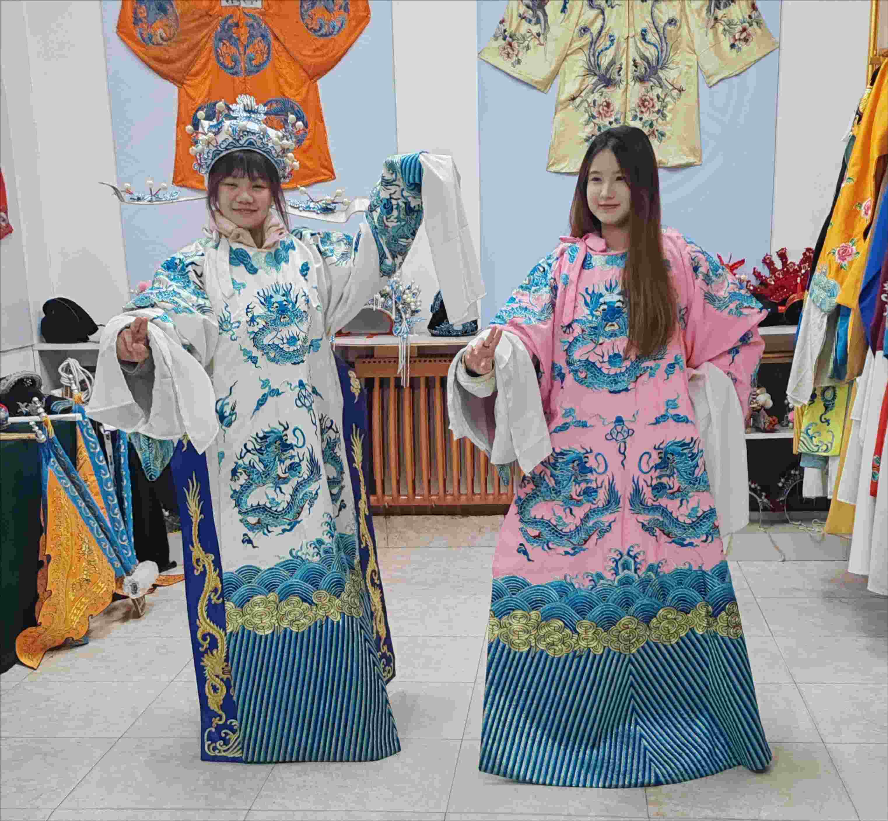 圖為實踐隊員試穿茂腔服裝,實踐隊員了解到不管冬夏,演員們上臺表演都會在戲服里面穿一層厚厚的衣服,以便撐起戲服。王中貞 供圖