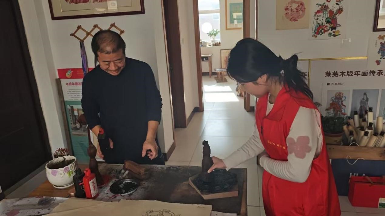 1月20日至1月25日,實踐隊奔赴濟南市萊蕪區,開啟了實地調研之行。他們穿梭在萊蕪的大街小巷,走訪了多位資深木版年畫藝人。在藝人的工作室里,隊員們全神貫注地觀察年畫制作的每一道流程。從一塊平整的木板,到上面逐漸雕刻出精美細致的圖案,再到調配顏料、印刷上色,每一個關鍵步驟都被隊員們詳細記錄下來。