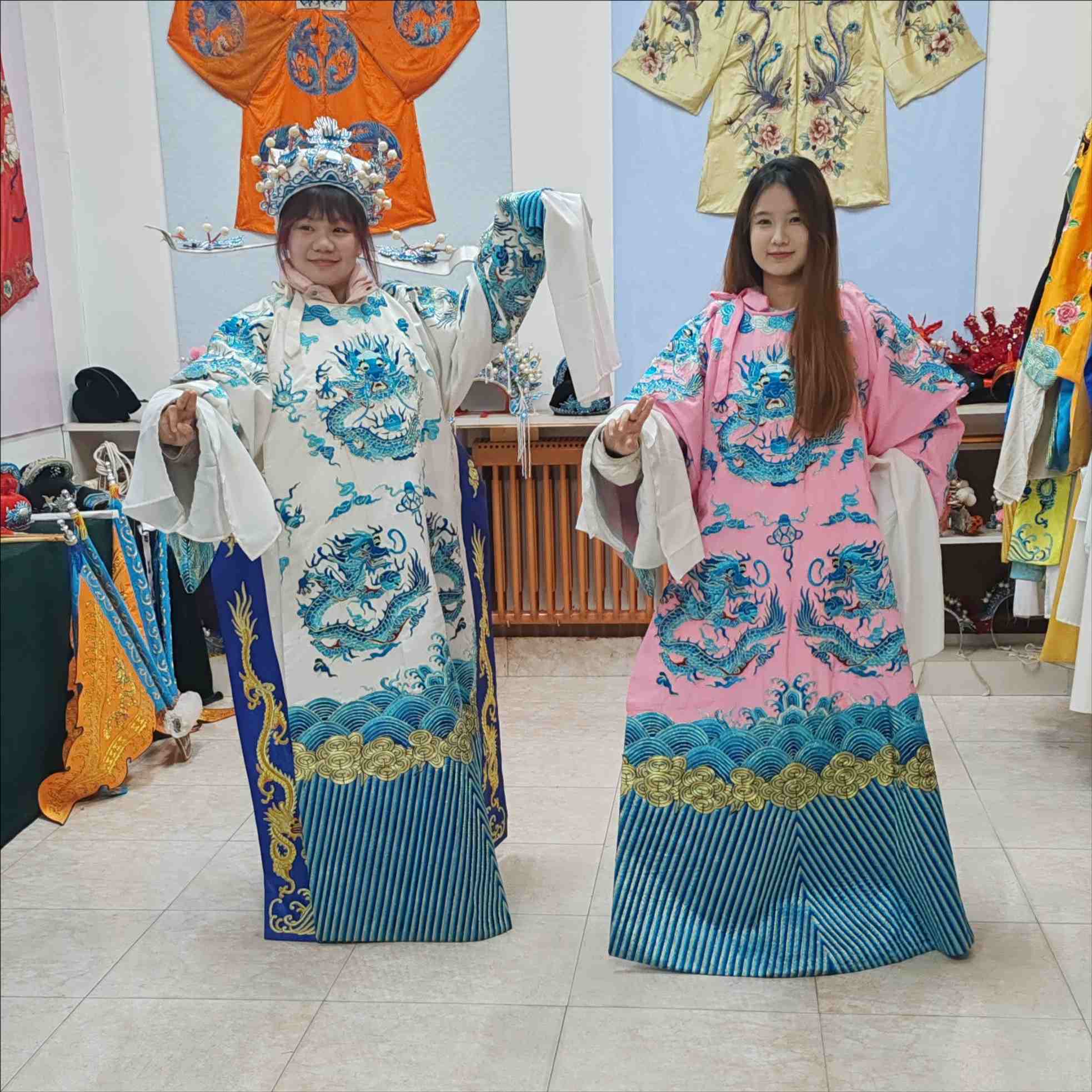圖為相關(guān)工作人員為實(shí)踐隊(duì)員們講解茂腔的演出戲服 吳俊瑤 供圖