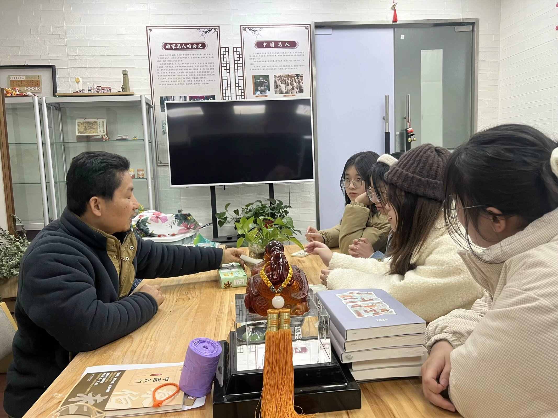 在朱建東老師的工作室,實踐團成員們開啟了泥人文化的奇妙之旅。朱老師展示了一系列充滿創意的泥人文創產品,如以六朝瓦當為靈感制作的開瓶器、冰箱貼,還有將魏晉南北朝出土人物元素二創成表情包制作的開瓶器,這些文創產品將古老的泥人工藝與現代生活巧妙融合。