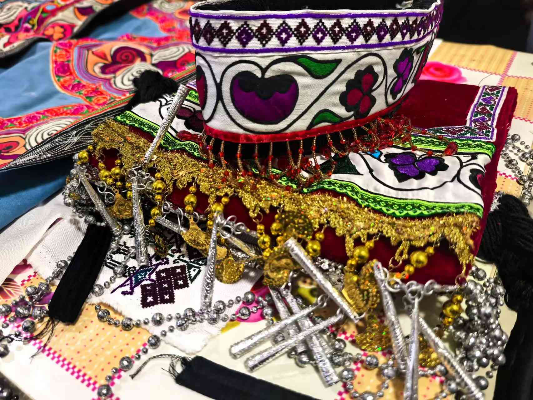 在與傳承人們的交談后,隊員們試穿了制好的彝族服飾,親自感受針線下文化的重量。在古代,赫章彝族服飾與四川涼山彝族服飾大致相同,但明、清以來服裝款式變化較大,帶有濃厚的地域色彩,到現在形成了獨具特色的服裝款式、花紋樣式。這些古老的服裝見證了赫章縣彝族歷史的變遷,是烏蒙山下孕育的獨特文化標志,“是一方水土養一方人”的生動詮釋。傳承人們制作服飾已經有幾十年,這些彩線和花紋串聯孩提時代和豆蔻年華,到如今時光沉淀,她們已經褪去青澀,針腳越發沉穩,而這些手制的衣物卻在一次次的清洗和晾曬后越發美麗,正如傳承人自己說:“越洗越好看!”一位傳承人向隊員們展示了自己的嫁衣,這件幾十年的彝衣到如今依舊發揮著功用,陪伴了她半生。她說:“這是手做的,一件穿幾十年都穿不爛。”