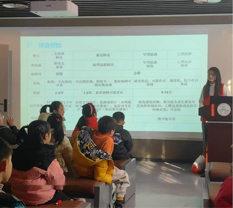 最后,俞晨璐同學具體介紹了甲乙流、新冠及支原體肺炎這四種常見流行性疾病的發(fā)展過程、相關癥狀和對應用藥,引導大家在發(fā)病初期可以居家正確判斷所患流行性疾病,從而及時干預并治療。鼓勵大家堅持做好疾病預防,一起帶動身邊人。以上活動過程將以視頻形式發(fā)布到成員個人社交平臺進行宣傳,并同步上傳疾病預防科普視頻,讓更多人了解并參與。
